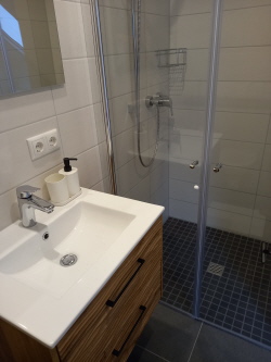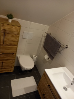 Bad mit geräumiger Duschkabine, Waschbecken und Badeschränkchen sowie eigener Toilette.
